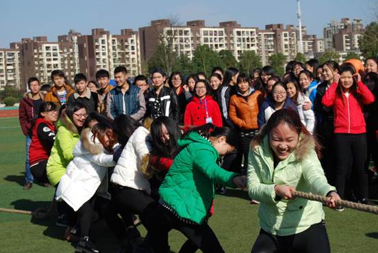 罗银舫院长还强调,我们要落实“每天锻炼了一小时,健康生活五十年,幸福生活一辈子”这个口号。“本次运动会正式开始”运动会也正式拉开了帷幕,激动人心的拔河比赛也随即开始了!双方同学紧紧抓着手中的绳子,齐心协力往后拉,虽然有的队伍输了,但是他们还是很开心,每个同学的脸上都洋溢着灿烂的笑容,在阳光的照耀下,显得更加有活力,展现出了当代大学生青春活力的风采。在比赛中更有热情的啦啦队为同学们高声呐喊喊着“加油 !加油!”加油!加油声,欢笑声此起彼伏,在这紧张时刻,同学们咬紧牙关,使尽全力,奋勇拼搏。每一个小组的参赛队员都全力以赴,赛出了运动的精神、赛出了大学生的风尚!