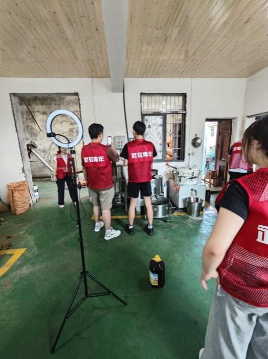 在当地制油工厂,实践团队开展生产全过程直播,直观呈现无添加、无污染工艺,增强消费者信任。直播后,成员们与油坊老板深入交流,为其解答经营困惑,持续合作助力产业升级,共同推动当地制油产业的发展用技术与真诚拓宽乡村产品销路。