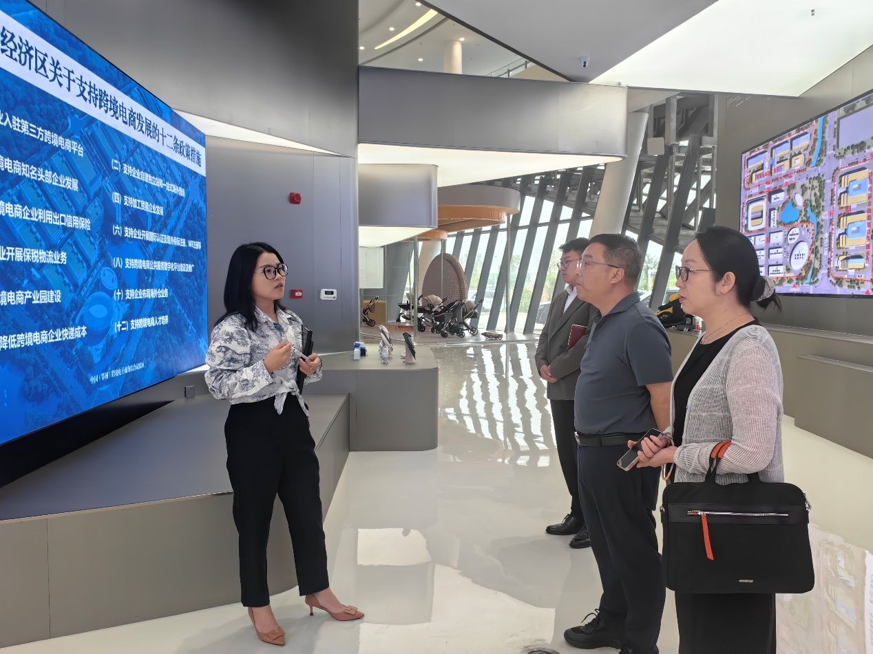在毕微负责人的陪同下,郭黎院长一行先后深入园区选品中心与直播基地进行实地调研。在选品中心,调研组直观了解了园区内涵盖家居日用、数码电子、特色轻工等多个品类的跨境商品布局与供应链管理模式;在直播基地,重点观摩了园区正在开展的无人直播技术测试场景,对跨境电商领域的数字化营销新趋势有了更深刻的认识,教师们结合教学实践与现场技术人员展开了热烈交流。