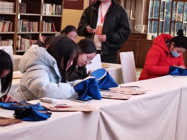 在“一带一路”国家馆红色书屋的“荆楚非遗大师讲堂”上,国家级、省级非遗代表性传承人给同学们带来了沉浸式文化研学。学子们围坐聆听,从传承人鲜活的讲述中,探寻汉绣、武当立式八段锦、红安绣活、土家织锦“西兰卡普”、黄梅戏等重点非遗项目,了解非遗技艺的工艺精髓。汉绣体验区中,学子们亲手参与汉绣制作,在传承人指导下尝试基础针法,感受传统技艺的独特魅力。