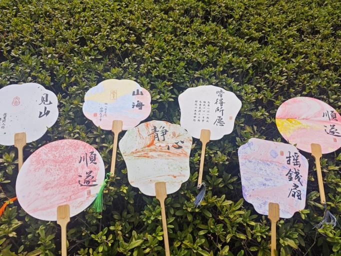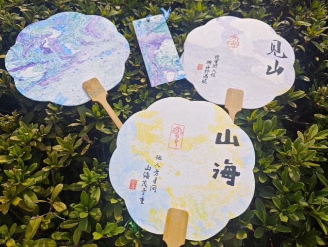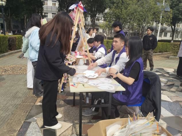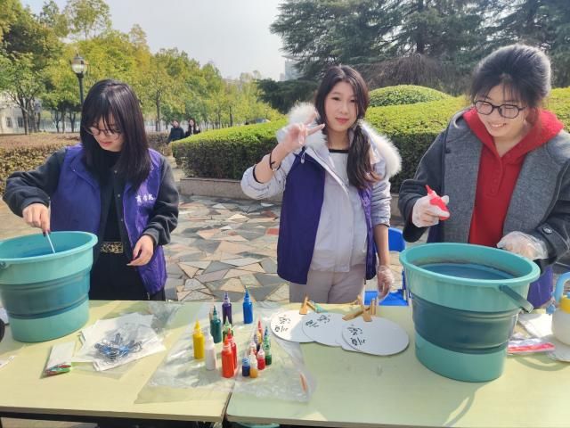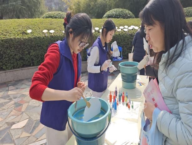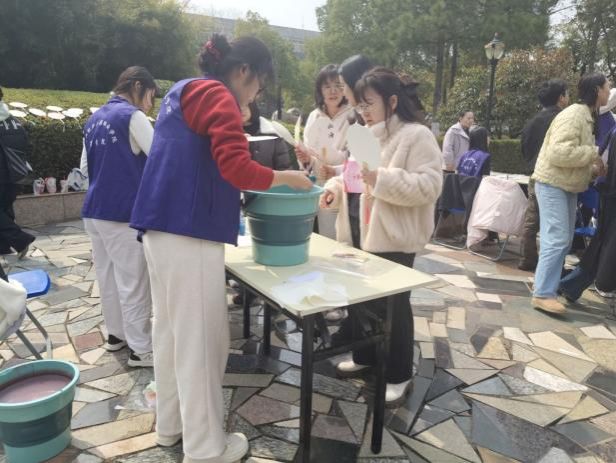 在非遗漆扇环节,同学们在志愿者的耐心指导下,亲手调配专属彩漆,将灵动的色彩轻覆于素净扇面,通过转印工艺创作出独一无二的梦幻漆纹。大家交流配色灵感、分享创作心得,在指尖流转间感受非遗技艺的匠心底蕴,在创作中寄托春日美好期许。