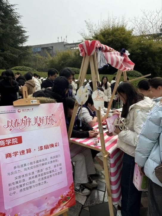为迎接第116个“三八”国际妇女节,致敬女性力量,丰富校园文化生活,传递温暖向上的节日氛围,3月5日,在校园“以春为序,美好予你”女生节主题游园会中,商学院以“商学速算·漆扇焕彩”为主题精心打造特色摊位,为同学们带来了一场春日限定体验活动。