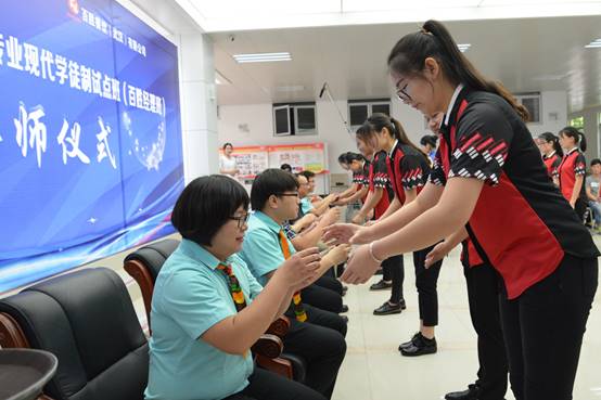老员工收新弟子,大学生当小学徒,这件传统而又新奇的事情就发生在我校。5月18日,校企双方在学术楼举行了一场庄重的签约暨拜师仪式。中国连锁餐饮排名第一的百胜餐饮有限公司和学校签订合作办学协议,学校、百胜、学生签订了现代学徒制试点“三方协议”。学校向百胜的员工代表颁发了“企业导师”聘书。来自现代学徒制试点班——商学院2016级“百胜经理班”的学生向百胜师傅代表躬行“拜师礼”,正式成为百胜“学徒”员工。