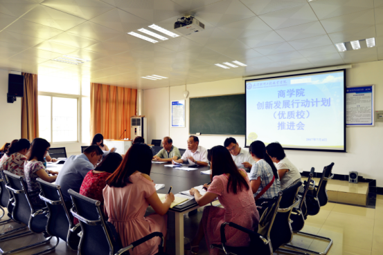 为加快创新发展行动计划(优质校)的建设进度,保质保量完成2017年度建设任务,7月4日下午14:00,商学院在1317教室组织召开优质校建设推进会。会议由院长罗银舫主持。院党总支书记刘扬、副院长郭黎、副院长刘春梅以及八大项目团队负责人、主要成员共计20余人参加了此次会议。