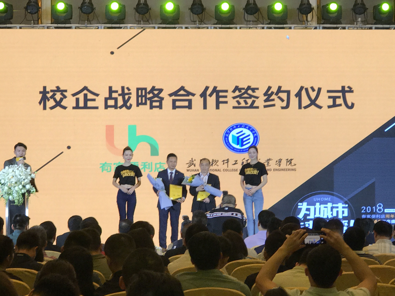 2018年5月22日上午,武汉软件工程职业学院商学院与有家实业(湖北)有限公司在武汉万达瑞华酒店举行了校企战略合作签约仪式。有家管理团队、商学院罗银舫院长、肖新梅副院长、连锁教研室周敏老师及有家合作伙伴等出席了签约仪式。商学院罗院长代表学校签署了合作协议。
