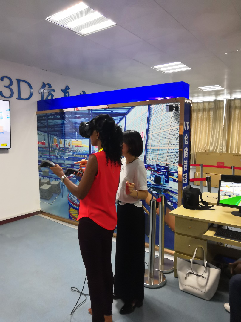 短暂的休息之后,学员们一行来到了物流VR实训室。这里一共有两组虚拟仿真设备,老师带领学生为学员们详细介绍了设备的操作方法和物流仓储作业流程,许多学员表现出了浓厚的兴趣,都要来试一试。下图为老师介绍及指导学员们体验VR技术。