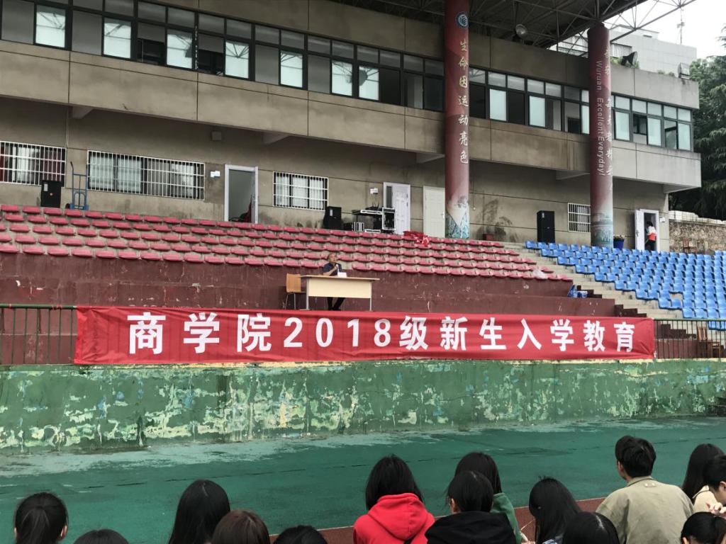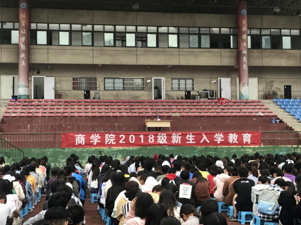 2018年9月26日上午,商学院在田径场为2018级新生举行了入学教育讲座。出席本次讲座的有商学院党总支书记刘扬,商学院学生科柯黎老师、赵珊老师,马克思主义学院谢开磊老师、人文学院文峥嵘老师,保卫处张劲老师,以及2018级辅导员老师和全体新生。