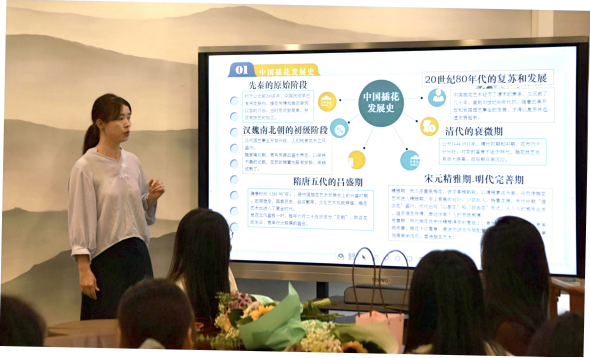 易超群老师首先讲解了中国插花发展史,介绍花材的特点以及如何造型,接着给大家展示了优秀的插花作品,在座的选手们频频点头称赞,看到老师完成的精美作品,大家更是兴致盎然、跃跃欲试。
