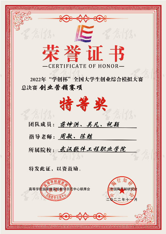 近日,由高等学校国家级实验教学示范中心联席会经管学科组、中国陶行知研究会主办的2022年“学创杯”全国大学生创业综合模拟演训活动全国总决赛在广东财经大学落下帷幕。商学院连锁经营与管理专业20级学子蒋坤洪、吴凡、祝颖组建的“001”团队成功斩获此项赛事的全国最高奖项特等奖,是湖北省唯一获得此项殊荣的高职院校。指导教师周敏、陈甦获“最佳指导教师”荣誉称号。
