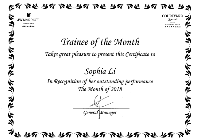 李格同学最终任职于杭州JW万豪酒店酒店采购部,谈到这次拿到优秀实习生她觉得十分意外也很开心,毕竟在这么多人中脱颖而出,她觉得很幸运。刚开始上班时,真的非常不习惯。面对十分陌生的环境,心态没有及时转变过来,各种矛盾和困难,让她在来的第一天她就打起了退堂鼓,但是在校学习时就对这个专业产生了浓郁的兴趣,也进行过很多实操课程的练习,老师们也都很亲切的帮助大家,学校还联系了这么好的单位可以进行实操,对我们这些毫无社会经验的学生来说真的特别棒,就这么回去了特别不甘心,再后来慢慢的也就适应了。她说参加工作后她发现除了英语和计算机操作能上手外,其他的什么都不懂,很多事情完全无法处理,只能去找领班主管来解决,这个时候才真正明白了解理论知识和实际熟练运用中还差着千山万水,于是,她抓紧一切机会学习部门需要掌握的技能,利用休息时多练英语口语和计算机能力,掌握酒店物品及食品采购流程的种种细节,现在已经能自如的负责酒店采购相关事宜。