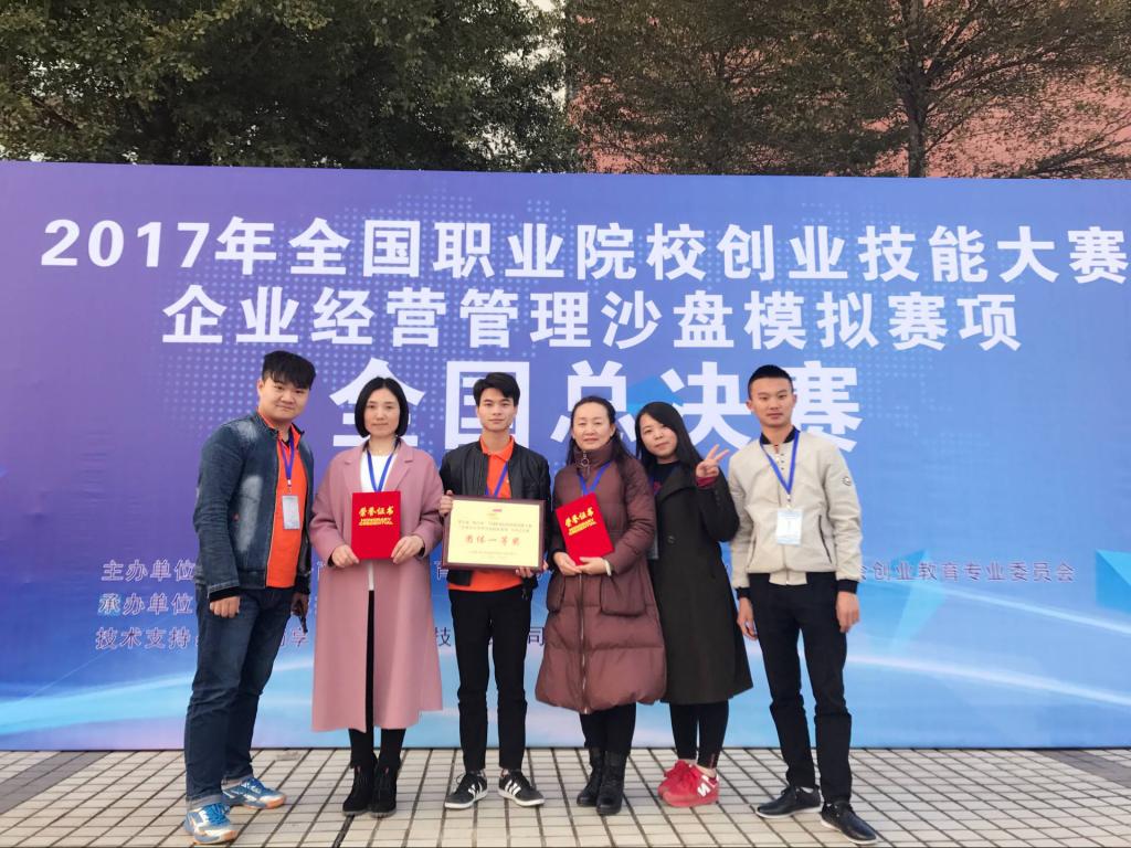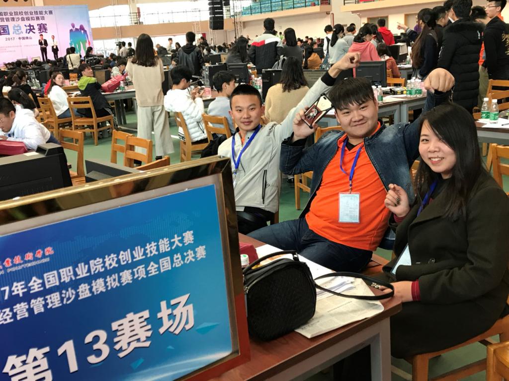 2017年12月9日,由教育部全国电子商务职业教育教学指导委员会和中国职业技术教育学会创业教育专业委员会主办的“第十届全国职业院校创业技能大赛企业经营管理沙盘模拟赛项”全国总决赛在佛山职业技术学院开赛,共有来自全国各地119所学校138支队伍近千人参赛。我校由商学院工商企业管理专业16级学生徐倩(女)、王超、沈聪和刘瑜四名学生组成的代表队经过一天的角逐摘取小组第一名,斩获团体一等奖;指导教师徐红梅、刘丽蓉获优秀指导教师荣誉。