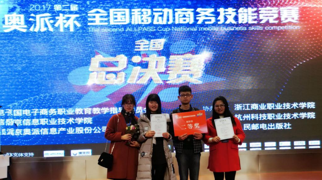 12月2日,2017年“奥派杯”全国移动商务技能竞赛全国总决赛在南京落下帷幕。我校由胡莹老师、马明明老师指导的商学院电子商务专业16级刘麒麟、袁梦、樊利凤三名同学组成的夏花队在大赛中成绩显著,从全国职业院校的81支队伍中脱颖而出,荣获全国二等奖。我校获最佳组织单位奖,胡莹老师、马明明老师获优秀指导教师奖。