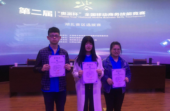 11月28日,由全国电子商务职业教育委员会主办的2017 “奥派杯”全国移动商务技能竞赛湖北省省赛在湖北科技职业学院落下帷幕。我校商学院电子商务专业由胡莹、马明明老师指导的“夏花队”在本次大赛中获得一等奖的好成绩,成功进入国赛;“阳光小队”和“开心麻花队”在大赛中获得二等奖的好成绩。“夏花队”获得最佳设计单项奖,我校获得最佳组织奖,胡莹老师和马明明老师分别获得优秀指导老师奖。
