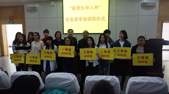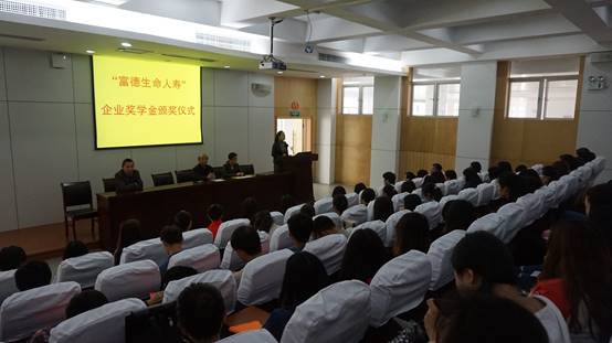 (本报讯 记者 徐秋月)4月1日下午14:00,“富德生命人寿企业奖学金”颁奖仪式在我校三号学术报告厅举行。武汉富德生命股份有限公司华中电销中心总经理王雅萍、人事部经理孙岚、商学院党总支书记刘扬、商学院党总支副书记肖新梅、学生科科长陈嘉及教研室主任黄海伦等金融专业的老师和学生参加颁奖仪式。颁奖仪式由黄海伦主持。