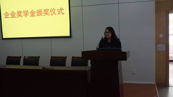 王总代表富德生命人寿企业对获奖同学表示祝贺,并介绍了富德生命人寿企业在高校设立企业奖学金的目的。2013级金融专业学生成有浪代表获奖同学发言,一方面对富德生命人寿企业表示感激,并表示会努力做好业绩,为企业做出贡献;另一方面,她向大家分享了自己从一个小丫头变成一个职场人的成长经历,八个多月的实习,让她体会到了“做什么事情都不是尽力而为,而是全力以赴”。