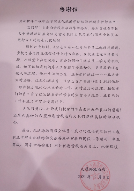 (通讯员:陈嘉)为有效提升员工形象,提升酒店服务质量,为酒店运营创造一个更好的社会环境,2021年12月我校文化旅游学院受九通海源酒店有限公司邀请进行酒店礼仪培训,旅游专业教研室安排陈嘉、王玉娟、孙伶俐3位老师进行培训事宜的接洽。