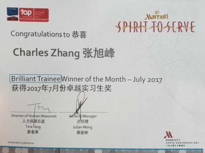 2017年8月下旬,在三亚万豪山海天酒店,一场激动人心的颁奖仪式正在进行,我院旅游专业实习生张旭峰从酒店六百多名实习生中脱颖而出,成为四名卓越实习生其中之一,获此殊荣,从总经理手中接过卓越实习生证书的他激动不已。