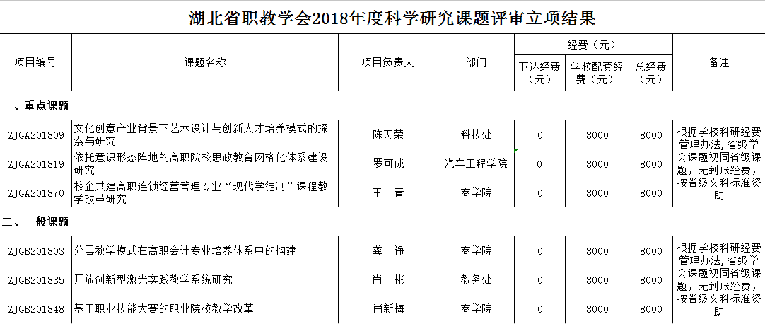 根据《关于下达2018年度湖北省职业技术教育学会科学研究课题评审立项结果的通知》(鄂职教学会【2018】12号) 精神,经教职工申报、科技处审核、省职教学会组织专家评审,我校推荐申报的7项课题,获准立项6项,现予以公布。