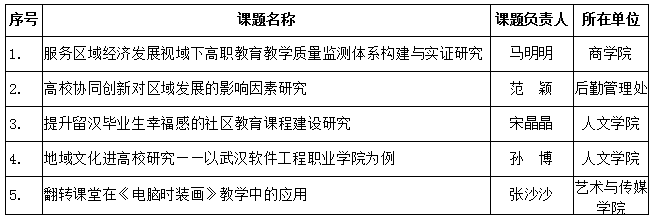 根据《关于组织申报武汉研究院2018年度开放性课题的通知》要求,经学校教职工申报、科技处审核、专家评审,拟推荐《服务区域经济发展视域下高职教育教学质量监测体系构建与实证研究》等5项课题申报武汉研究院2018年度开放性课题(具体见附件),现予以公告。