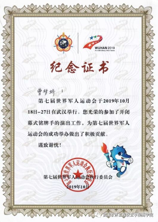 2019年5月,曹梦娇成功入选军运会开幕式举牌手,参加了市里为期3个月的集训。