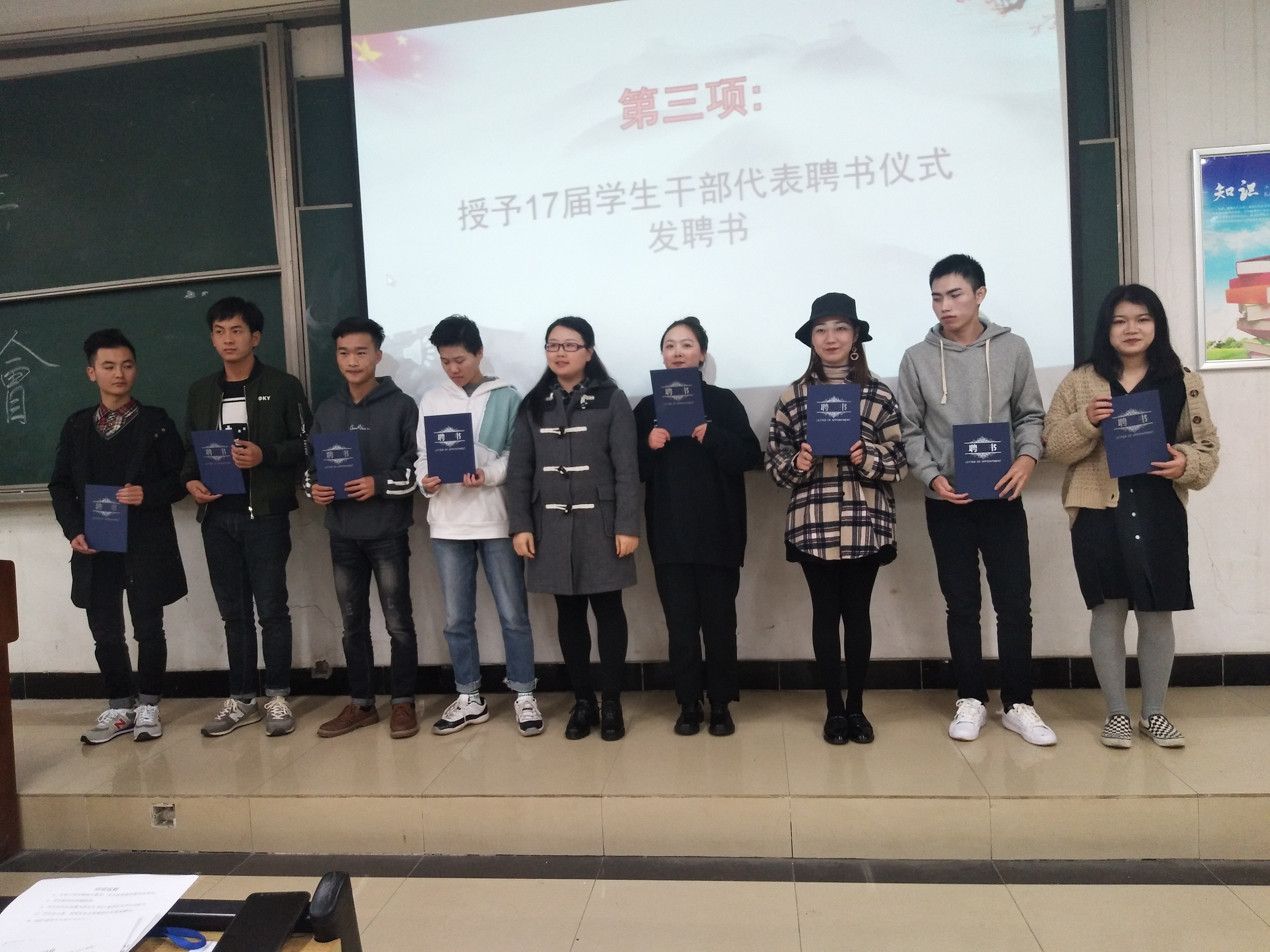 此次大会商学院赵珊科长表达了对上一届干部工作的肯定和对他们的殷切期望与不舍。17届团总支副书记高科的工作经历让大家受益匪浅。作为18届的学生干部代表青协会长程亿,也向学长学姐们表达了祝贺。团总支负责人彭老师表示了自己对18届干部的期望,并且希望17届的干部能够记住自己永远是商学院团学组织的一员,希望新一届的干部能够好好带领商学院发展商学院。