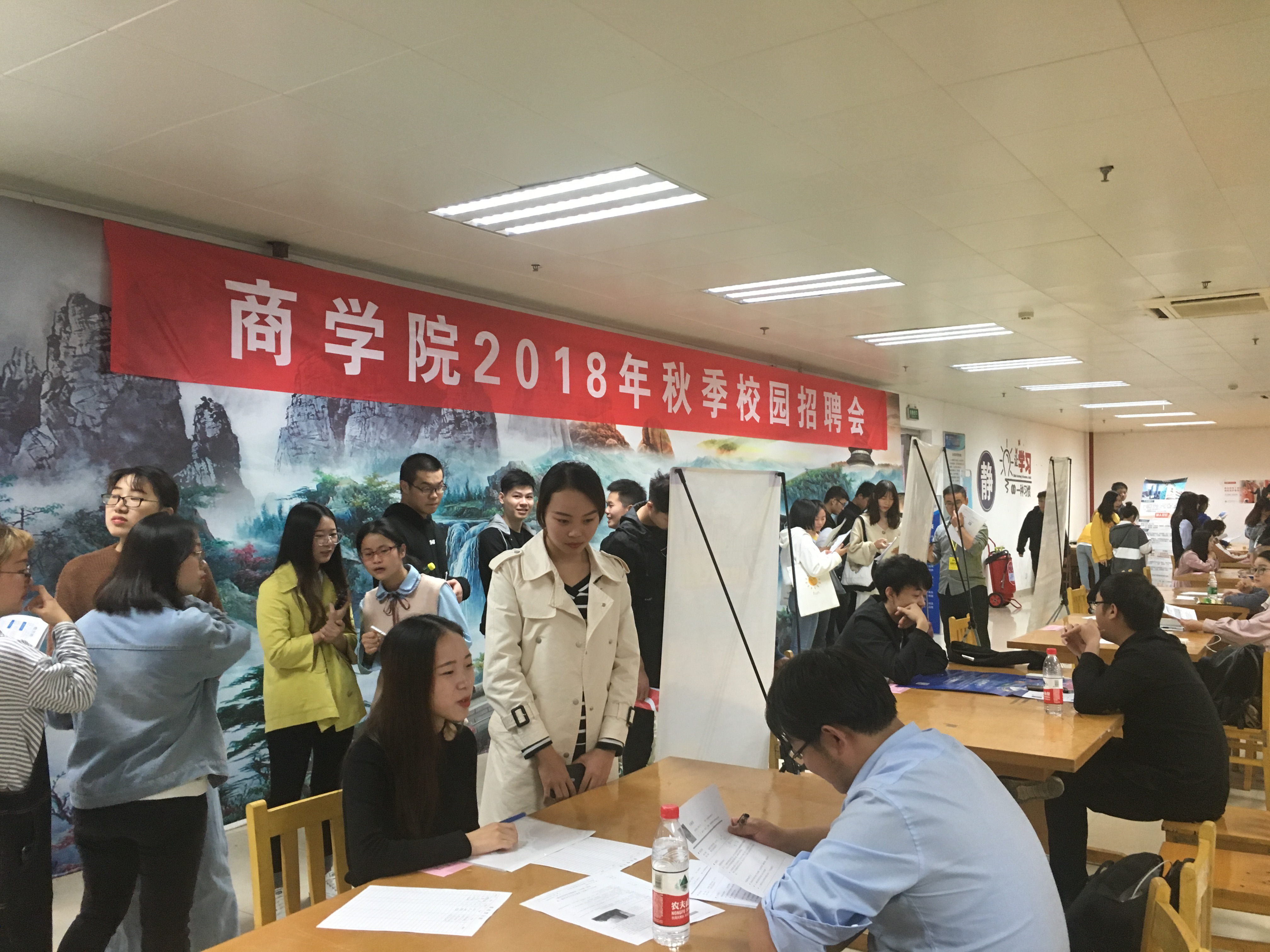 (商学院青协董延讯)11月3日中午13:00分,商学院在图书馆一楼自修室开展了秋季校园招聘会。沃尔玛(中国)有限公司、百世物流科技(中国)、苏宁云商集团股份有限公司、中国平安(集团)股份有限公司等28家企业应邀参加了此次招聘会,为我院毕业生提供了物流专员、导游、会计、人事专员、销售等不同领域的岗位约1000个。