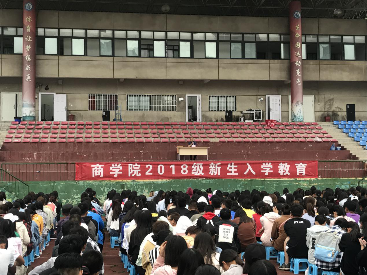 (通讯员:杨枫 高姗姗) 2018年9月26日上午,商学院在田径场为2018级新生举行了入学教育讲座。出席本次讲座的有商学院党总支书记刘扬,商学院学生科柯黎老师、赵珊老师,马克思主义学院谢开磊老师、人文学院文峥嵘老师,保卫处张劲老师,以及2018级辅导员老师和全体新生。