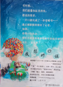 (通讯员 阮方)为响应学校第十三届心理健康活动月“心导航”的号召,增进学生之间的情感,同时提升他们的心理素质,增强凝聚力和创造力,促进大学生心理健康成长,商学院于2017年3月开展了以“我想对你说”为主题的心理健康活动。