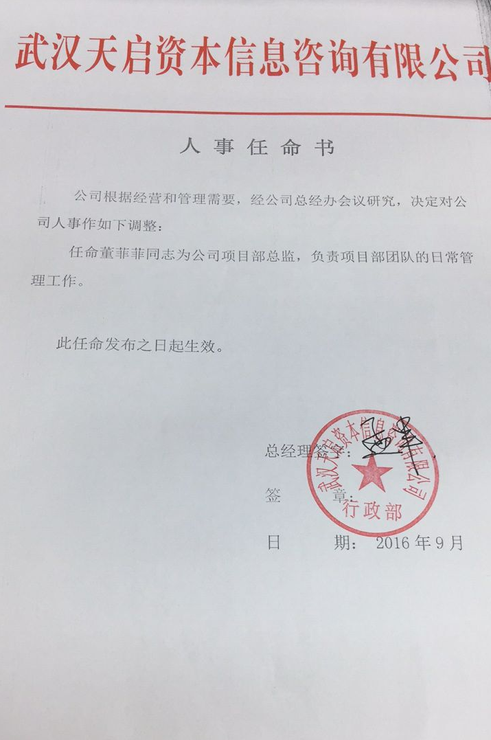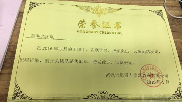 董菲菲,女,原商学院连锁1201班班长,工作中积极为班级做贡献,学习上努力认真,曾多次获得三好学生,国家励志奖学金等奖项。毕业之后任职于武汉天启资本信息咨询有限公司。2014年12月份进入天启资本,在3个月的适应期之后,一直是公司的销售冠军,在2015年的11月份升为经理,所带领的团队是整个公司业绩的前三名,于2016年9月份担任业务部总监。负责团队建设以及营销,销售。现管理50个人的团队,是天启资本信息咨询有限公司第五分部负责人。基本薪酬在12000-20000。
