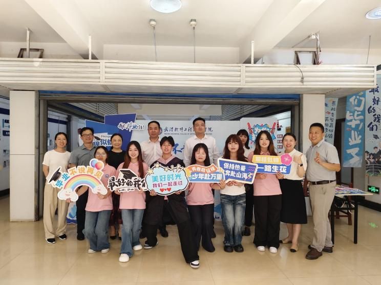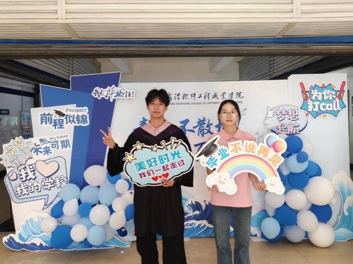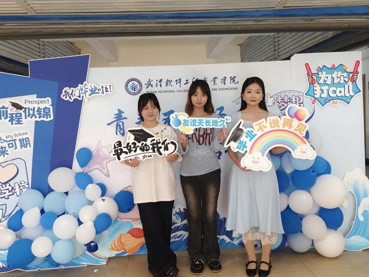 在主题展板前,毕业生们手持定制“毕业季”手卡,与老师、同学合影留念,定格美好记忆。同学们三三两两相拥而立,有人轻挽着室友的手臂,有人将头轻轻靠在同窗肩头,脸上洋溢着灿烂的笑容。