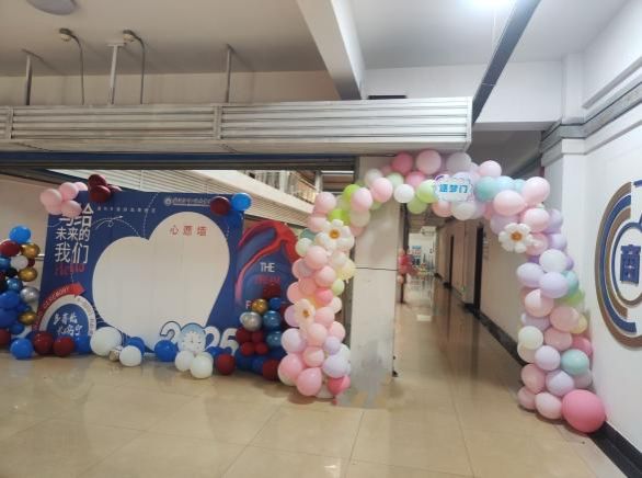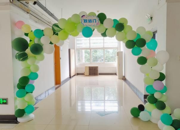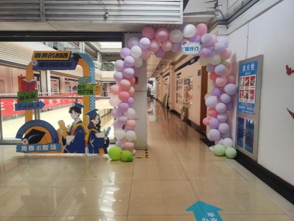 商学院以四道气球拱门为视觉核心——“启航门”由湛蓝色气球簇拥成浪;“砺行门”以深紫色气球编织成藤蔓造型,表现“路漫漫其修远”的求索精神;“逐梦门”用樱花粉气球与花朵气球搭建彩虹拱顶,如理想绽放时的绚烂光晕;“致远门”以墨绿与浅绿气球层叠铺展,让“行稳致远”的嘱托在光影中流转。四大拱门形成沉浸式毕业长廊,织就青春仪式感。