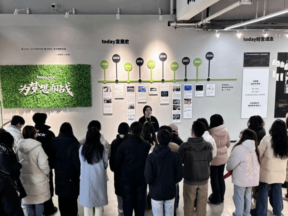 活动伊始,企业负责人为师生们讲述了today便利店的创业故事与发展历程。从品牌创立之初的艰辛探索,到逐步在竞争激烈的便利店市场站稳脚跟,today凭借独特的企业文化和数字化创新经营理念,不断发展壮大。today梦工厂作为企业的核心场所,承载着品牌的创意与梦想,集办公、产品研发、文化展示等多功能于一体,让师生们切实感受到企业的活力与实力。