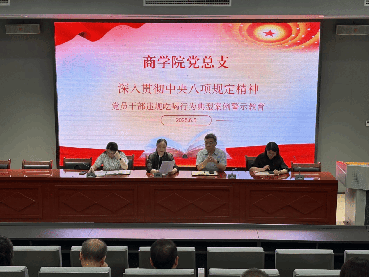 (通讯员 黄培)6 月 5 日下午,商学院在行政楼 3 号报告厅召开《深入贯彻中央八项规定精神警示教育大会》。全院党员教师参加会议,会议由商学院党总支书记王鹰主持。